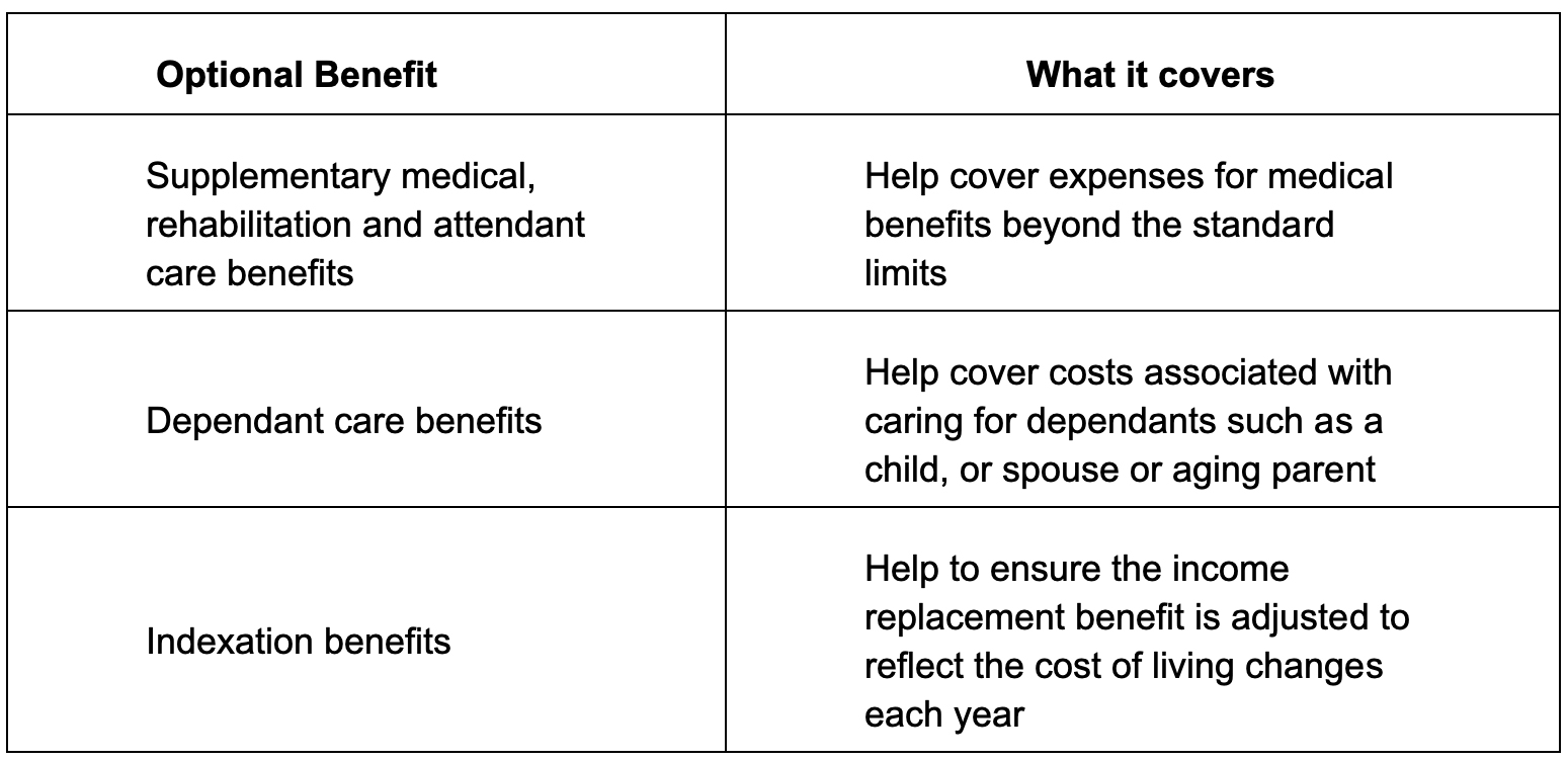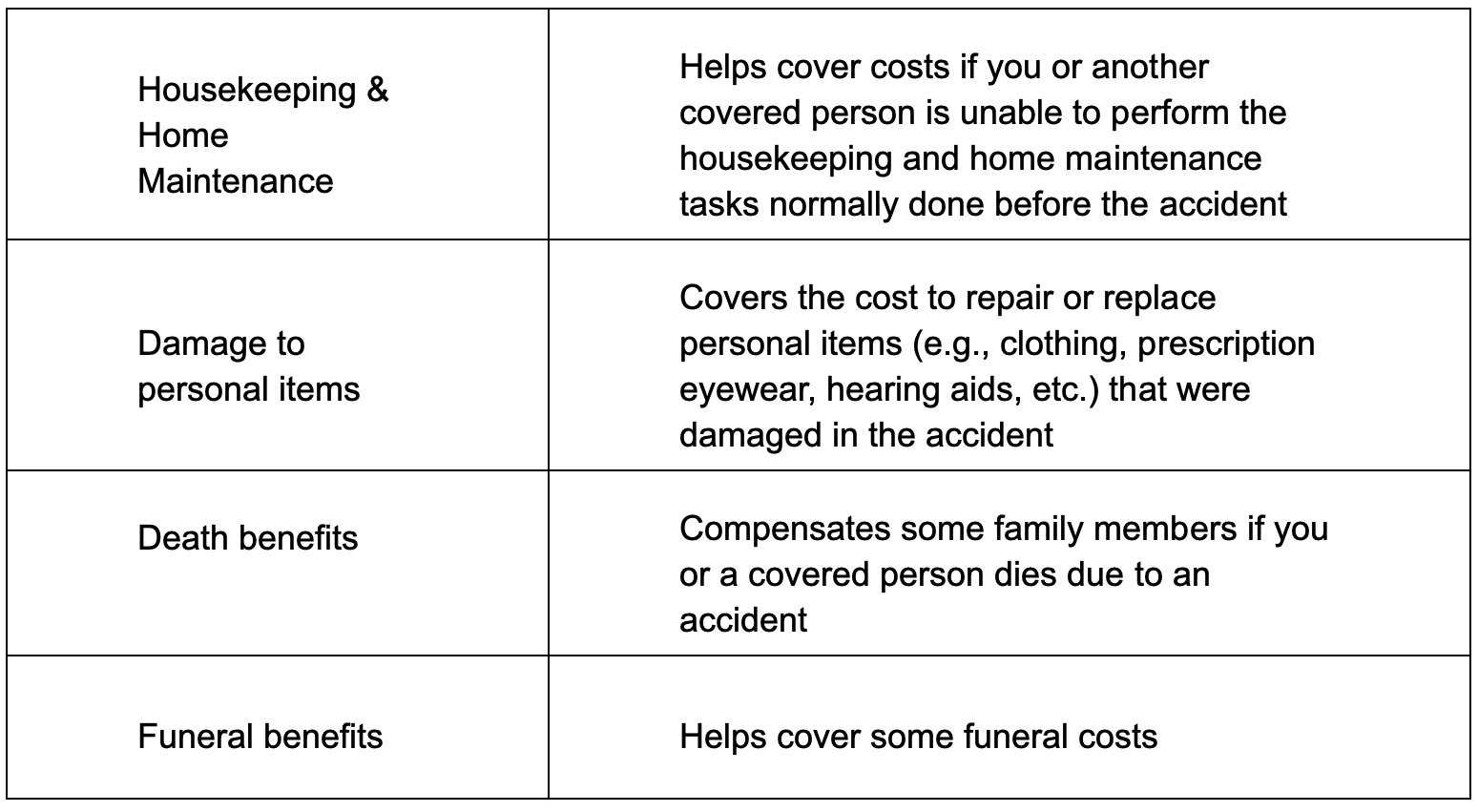 The following chart describes the benefits that will become optional on July 1, 2026. If a driver chooses not to have the following optional coverage, then the benefits will no longer be available in the event of an automobile accident.